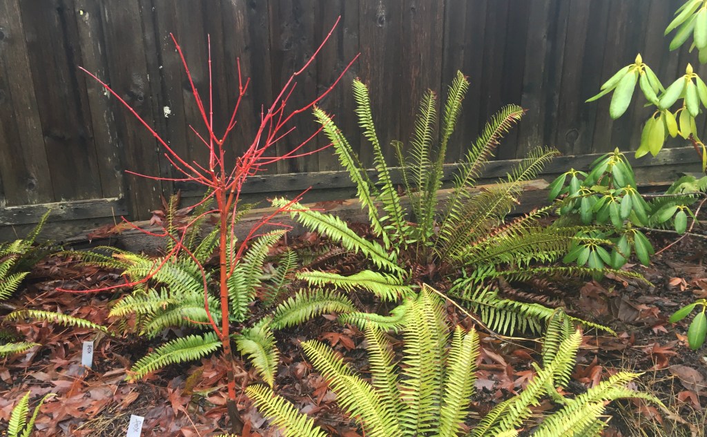 These ferns were really languishing in the front garden, where they were blasted with the hottest summer sun. They should be much happier here in the woodland garden, where they offset the red of the coral bark maple beautifully. I love ferns, especially mass planted like this. It’s really amped up the woodland vibe too.
