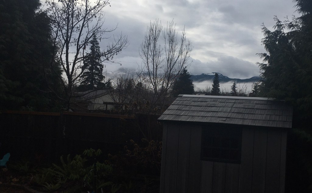 I captured this gloomy light just after 11am. The camera doesn’t do it justice, but you can make out all the trees on the mountain after these first few snowfalls. It’s my favourite mountain view.